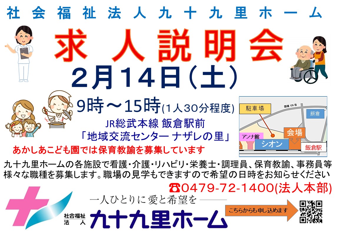 2月14日(土)医療・福祉・リハビリ・保育・調理等の求人説明会を個別で行います。希望の時間をお知らせください。この日が都合の悪い方は他の日で調整しますのでお電話ください。 0479-72-1400、またはお問合せフォームから。